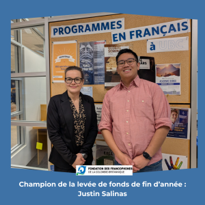 Ce que la bourse d’études postsecondaire de la Fondation des francophones de la Colombie-Britannique a changé pour Justin et sa famille : « Issu d’une famille monoparentale et immigrée, la bourse a payé presque un quart de mes frais de scolarité de mon BEd, ce qui est ÉNORME pour moi et ma famille. Donc encore merci mille fois pour votre générosité et celle de tous ceux et toutes celles qui appuient la mission de la Fondation ».
