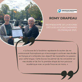 La Fondation est heureuse d’annoncer la remise de quatres bourses d’études postsecondaires en français d’un montant de $3 000 chacune aux étudiant.es suivant.es :